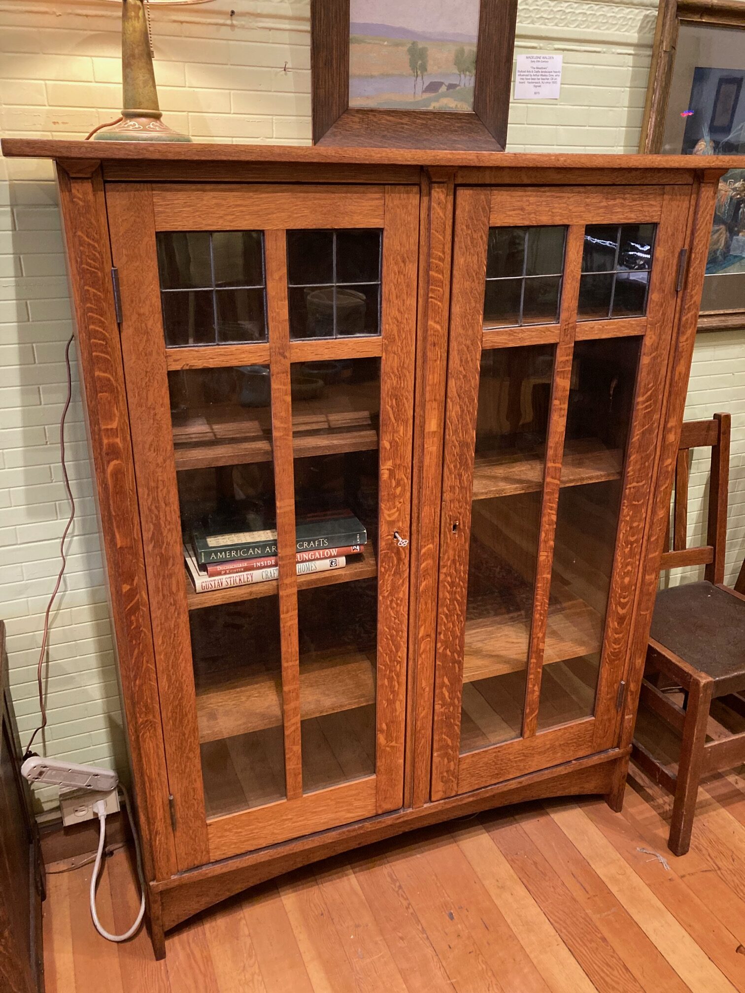 Classic bookcase with leaded glass, pronounced arch and through tenons on the sides.  All original glass.  Excellent quartersawn grain throughout.  48″ wide by 58″ tall.