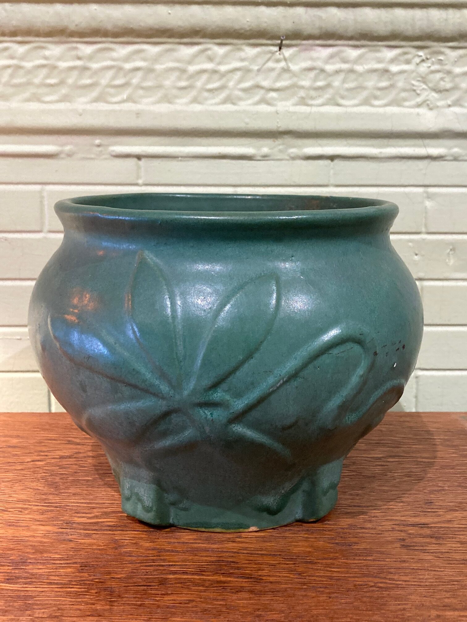 Zanesville stoneware jardiniere with nice deep green glaze. Measures 7″ tall. Small nick to bottom rim.
