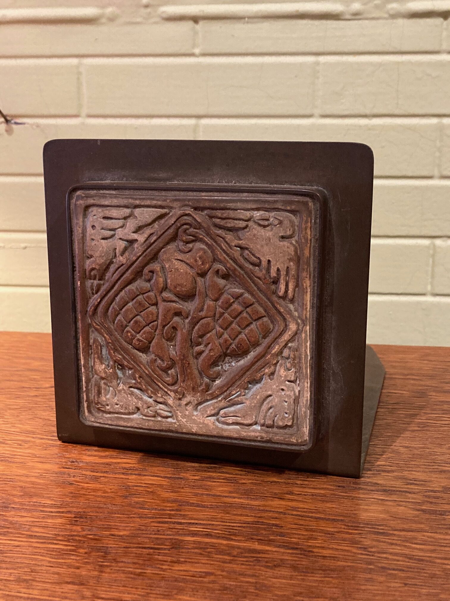 Single bookend with uncommon Batchelder tile. Original patina. Signed.